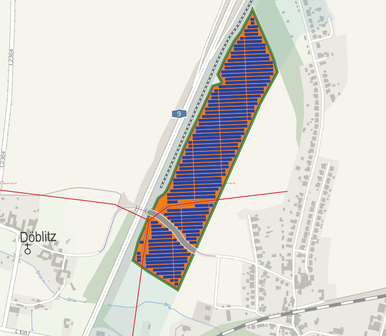 Die Haslaer Straße teilt das Plangebiet in zwei Teile. Der Gesetzgeber hat innerhalb der 200m Streifen um die Autobahnen und Schienenstrecken die Errichtung von Solarparks über die baurechtliche Privilegierung aufgrund der Vorbelastung der Natur und Landschaft vorgesehen. Die Fläche des Solarparks Döblitz eignet sich somit hervorragend zur Produktion von sauberem, grünen Strom.